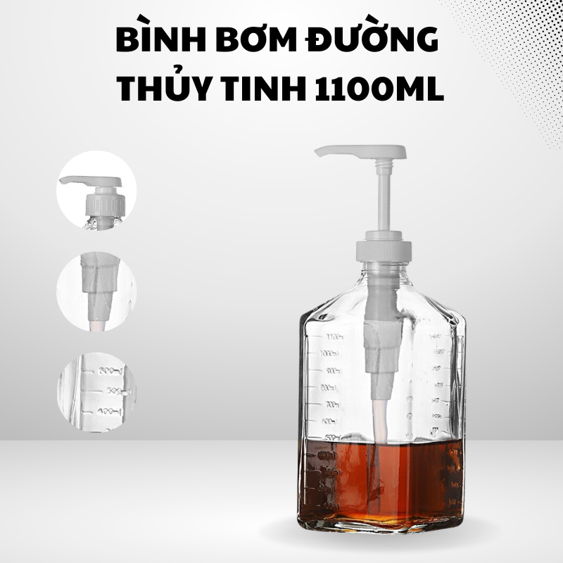 Thứ hai, bình bơm siro đường có pumb 1100ml làm bằng thủy tinh trong suốt. Trên thân bình bơm siro có đánh dấu to và rõ ràng từng mốc thể tích; giúp bạn dễ dàng quan sát thể tích nguyên liệu bên trong.
