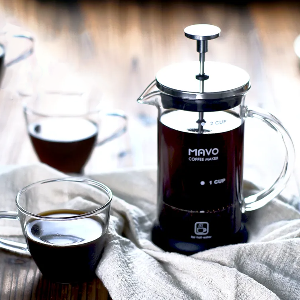 Bình MAVO có thiết kế tinh xảo với chất liệu bình bằng thủy tinh chịu nhiệt chất lượng cao có độ trong suốt cao và rất chắc chắn. Tay cầm của bình được làm bằng nhựa PP để bạn có thể an tâm bưng bê mà không sợ bị bỏng. Lớp bọc bên ngoài, và qua đó tránh tiếp xúc với nhiệt độ cao của cà phê. Bộ lọc Piston được làm bằng thép không gỉ, bình lọc có ưu điểm làm tăng khả năng lọc làm tăng khả năng lọc tinh tế của bình, nên rất hạn chế căn cà phê khi uống – một nhược điểm thường có trên bình pha French Press thông thường.
