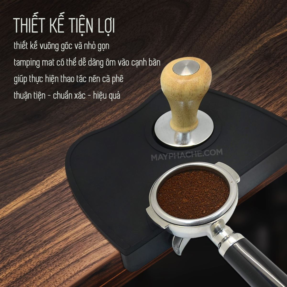 Hoàn hảo nhất là những chiếc đế lót tamper espresso có kích thước nhỏ gọn; không chiếm nhiều diện tích của quầy pha chế. Chúng nên có vùng khuyết nằm ngoài; ôm bo cạnh hoàn hảo cho quầy thu tiền. Bạn hãy chắc chắn chiếc để lót tamper của mình có độ bám tốt và không bị di chuyển trong khi bạn đang làm việc.