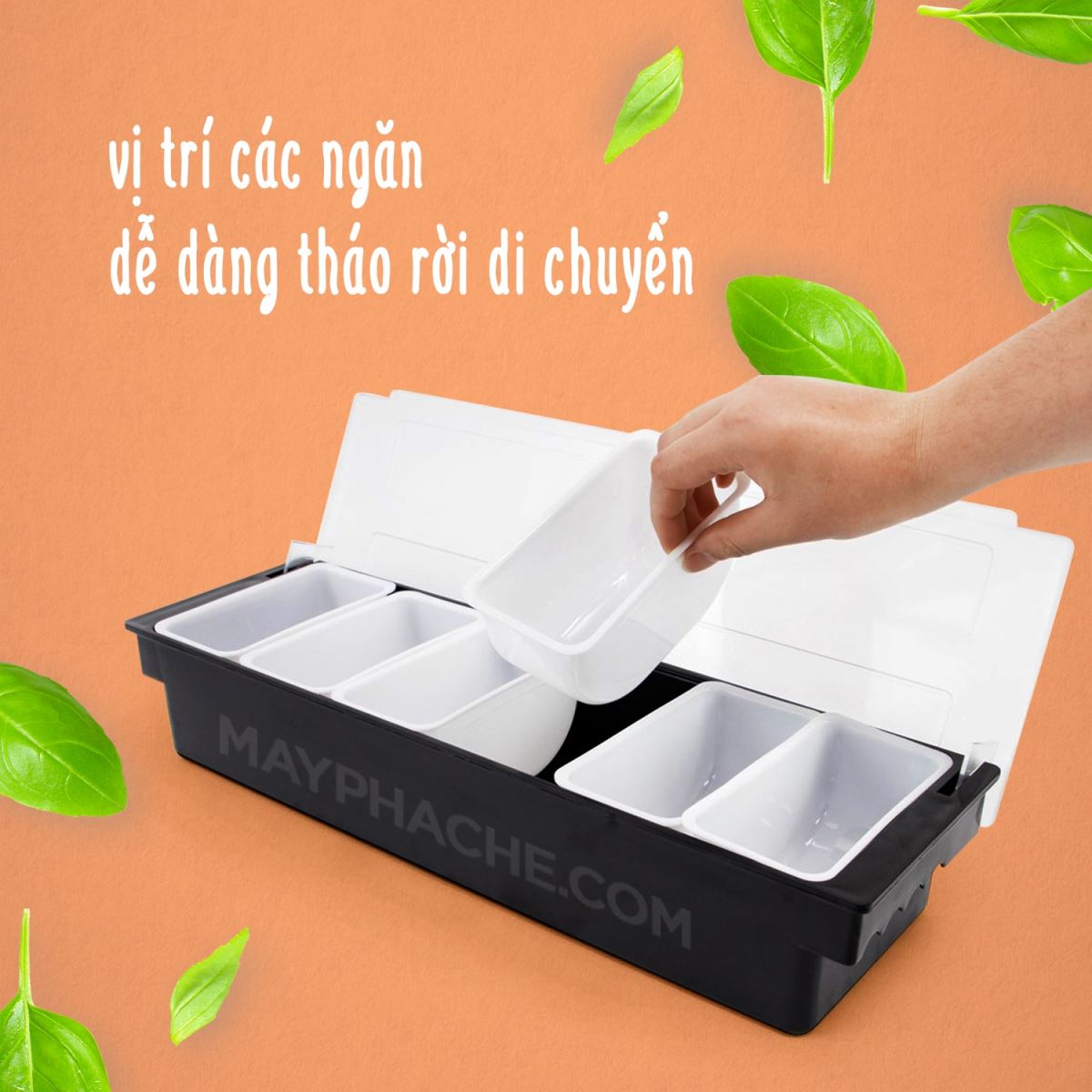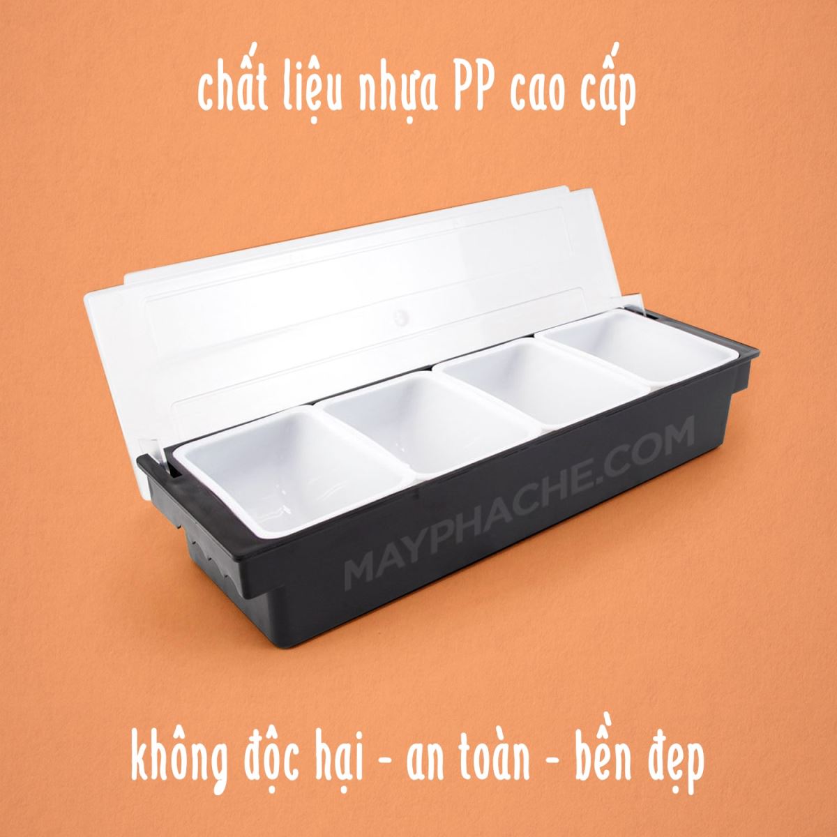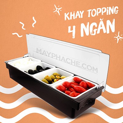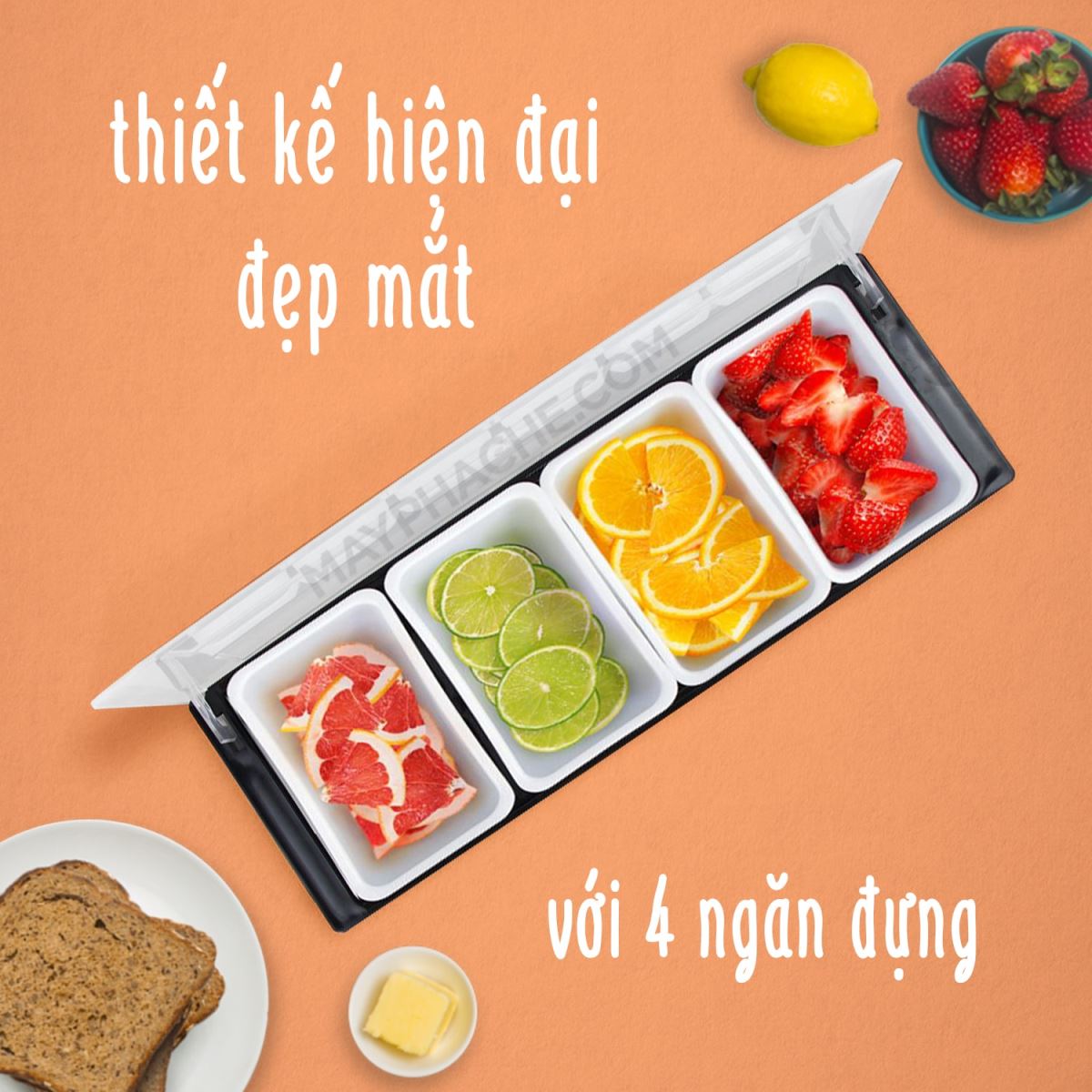 Khay đựng được thiết kế với 4 ngăn, giúp đựng 4 loại topping khác nhau. Nhờ đó, nhân viên pha chế có thể lấy nguyên liệu nhanh chóng; dễ dàng. Thiết kế nắp nhựa trong giúp bạn nhìn rõ các loại nguyên liệu để lựa chọn cho phù hợp. Khi đông khách, những khay đựng topping tổng hợp này giúp bạn thao tác nhanh; tiết kiệm vô số thời gian.