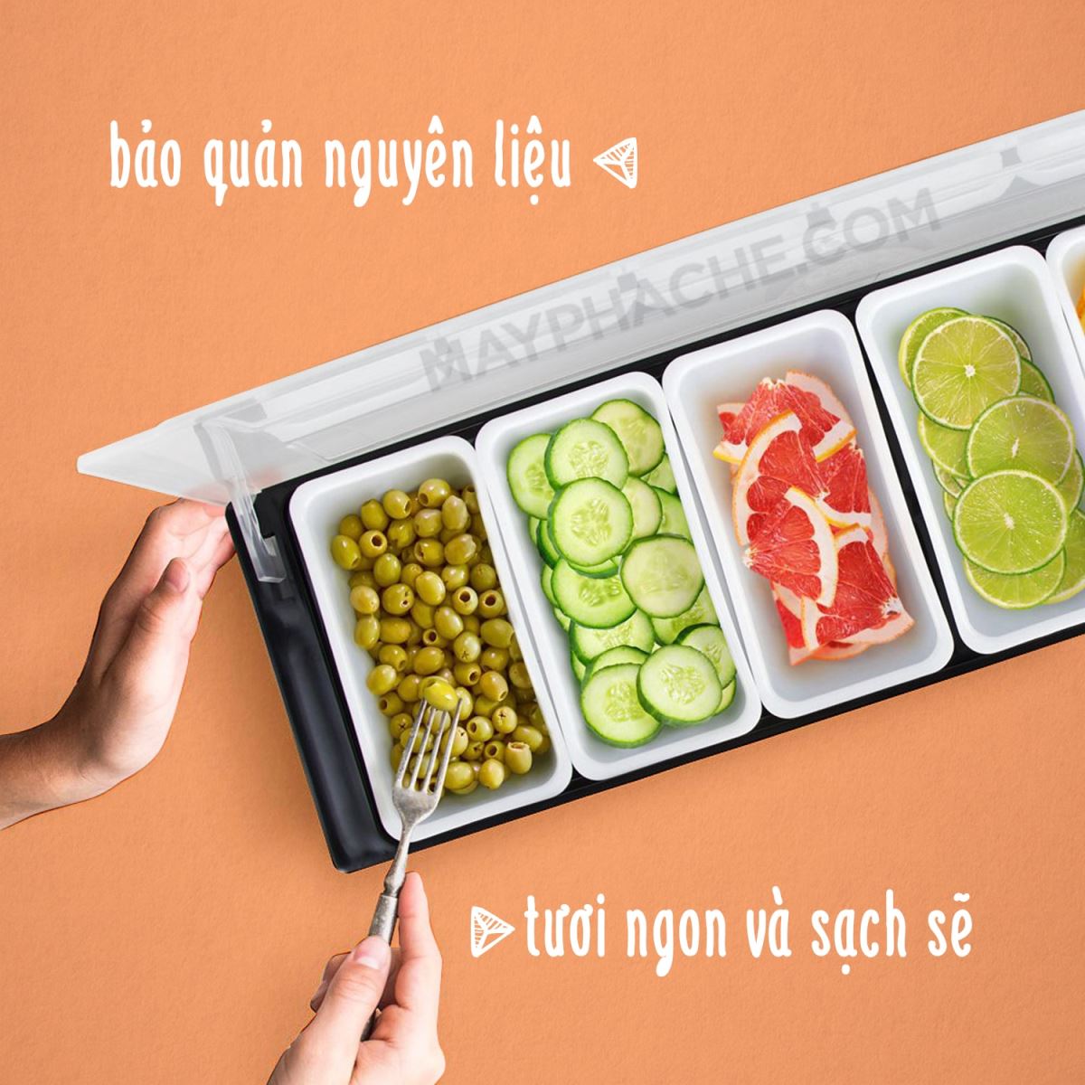 Công dụng đầu tiên cần nhắc đến của chiếc khay này là chứa đựng các loại hoa quả, topping. Nó giúp nguyên liệu pha chế đồ uống luôn được bảo quản sạch sẽ. Bụi bẩn, côn trùng không thể tấn công làm ảnh hưởng đến chất lượng topping; hoa quả. Nhất là trái cây tươi sẽ luôn giữ trọn được sự tươi mới và hương vị thơm ngon với khay đựng topping 4 ngăn.