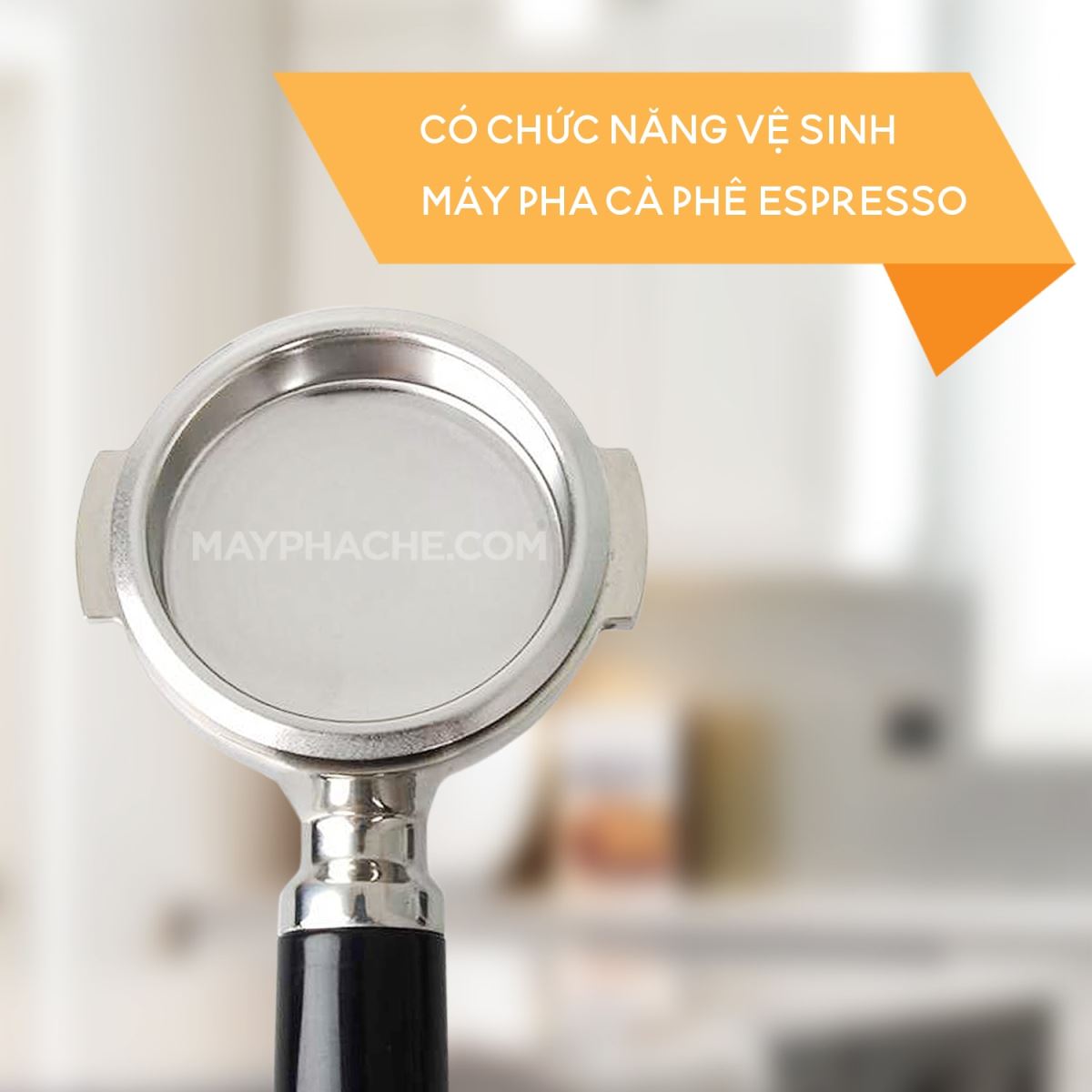 Bạn nên sử dụng bột vệ sinh thương hiệu Cafiza nhập khẩu của Mỹ. Ưu điểm của loại bột vệ sinh máy pha cà phê này là làm sạch bằng bọt và khả năng hòa tan. Chất tẩy rửa trong bột vệ sinh có thể loại bỏ các vết ố, bột cà phê bám dính chặt trên bề mặt; đặc biệt là an toàn vì đã được cấp phép lưu hành tại Mỹ và thế giới. Khi đã pha bột vệ sinh xong, bạn lắp tay pha vào họng chiết xuất của máy.