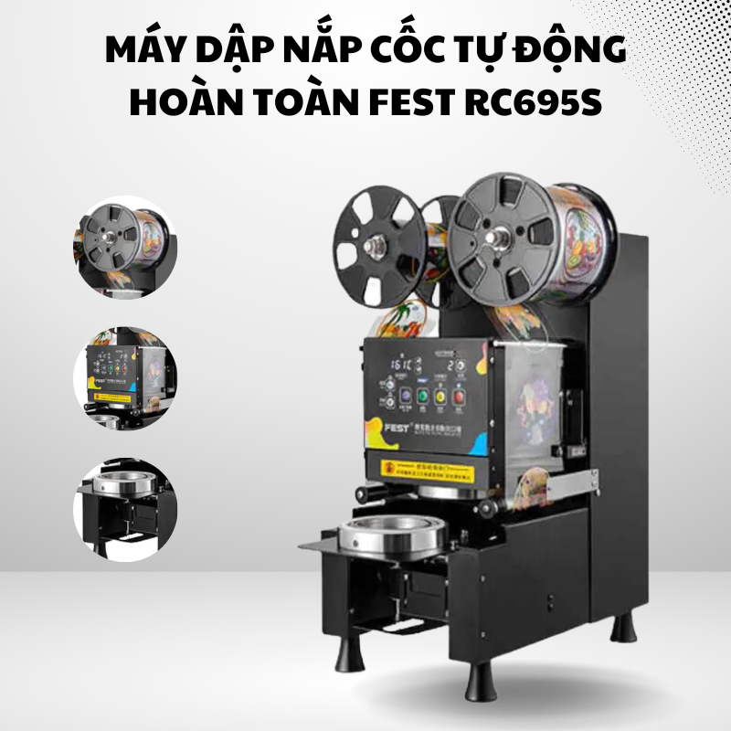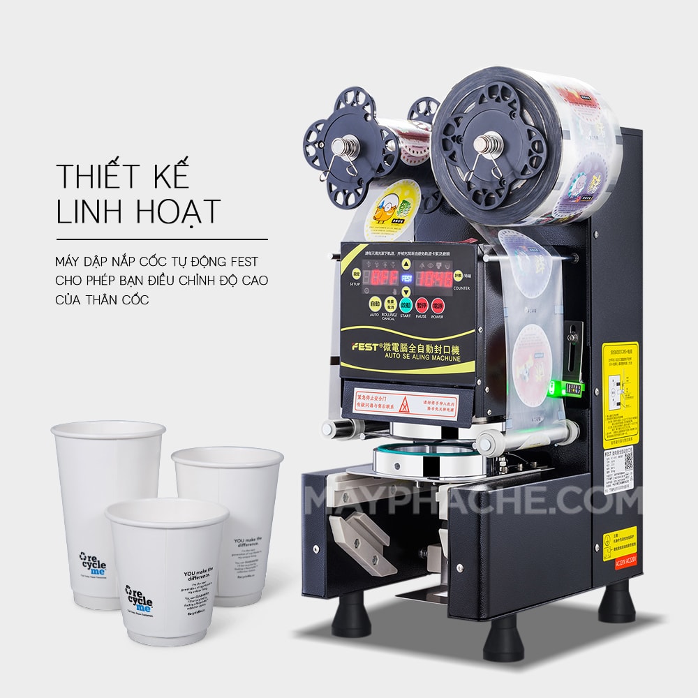 Thiết bị dập nắp cốc tự động Fest sử dụng để dập nắp cốc đồ uống cho trà sữa, nước mía; sinh tố, chè, nước trái cây… Dập nắp cốc phục vụ cho những khách hàng có nhu cầu mang đồ uống đi mà không thưởng thức tại quán; bảo đảm không bị sánh nước đồ uống ra ngoài. Máy Fest dập nắp cốc ứng dụng trong các quán trà sữa, quán cà phê; quán chè, trong nhà hàng, khách sạn…