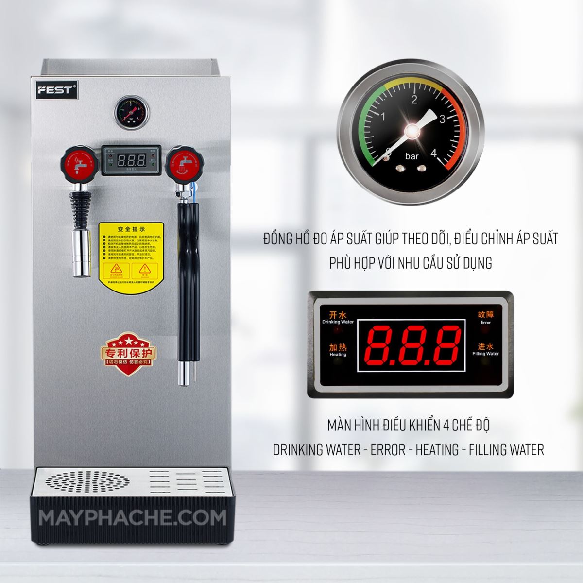Máy đun nước áp suất cao Fest có thiết kế nhỏ nhắn nhưng công suất mạnh mẽ. Hai chức năng chính của máy là đun nước nóng và tạo bọt sữa; đều sở hữu hiệu suất mạnh mẽ với cả hai chức năng này. Thiết bị được ứng dụng cho rất nhiều mô hình kinh doanh đồ uống như quán cà phê; quán trà sữa, quầy bar, nhà hàng, khách sạn…