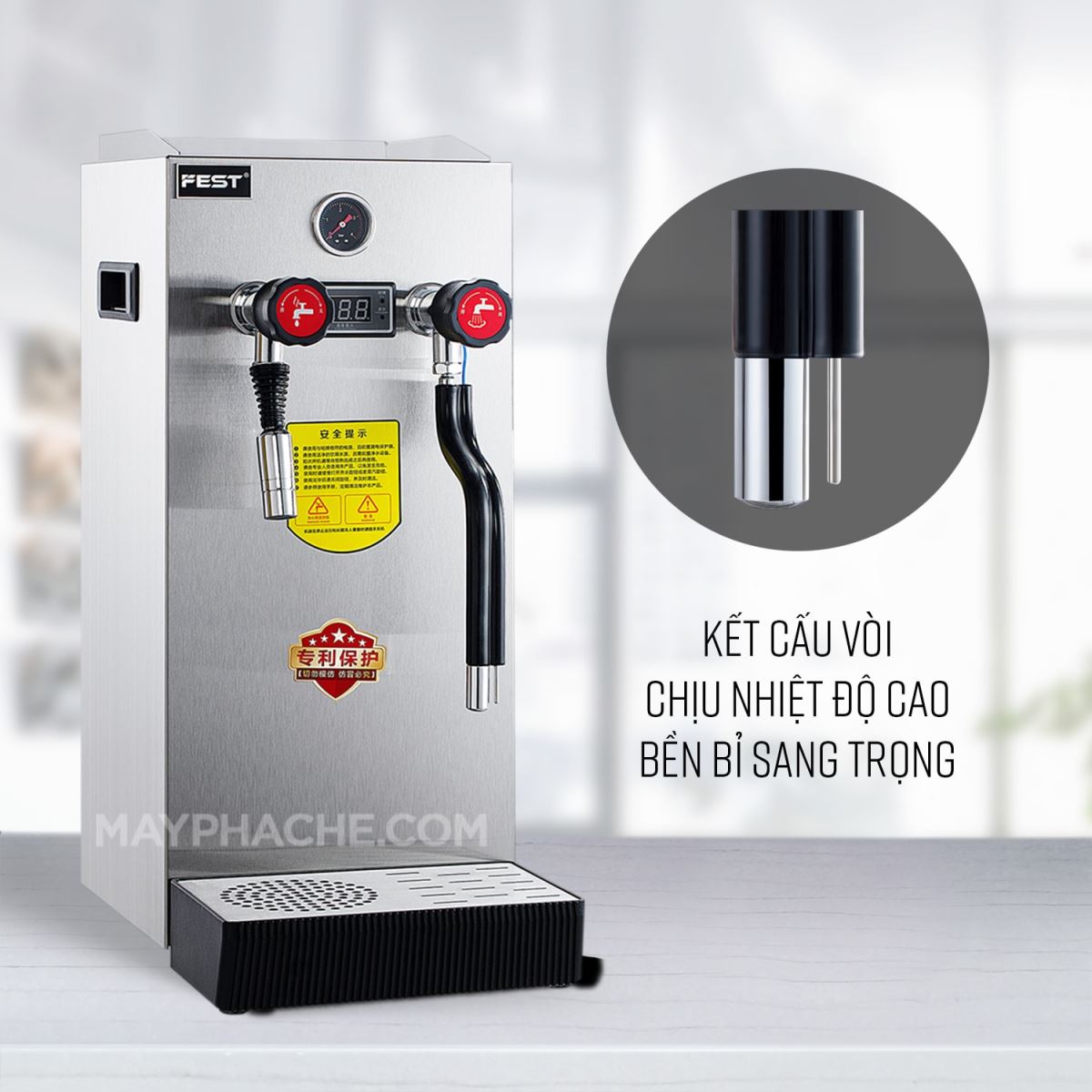 Công suất mạnh mẽ cho phép máy đun nước nóng Fest ra nước nóng nhanh chóng; mỗi lần ra nước nóng đạt dung tích 2 lít. Quy trình đun nước nóng khép kín, tự động hoàn toàn; vòi sục hơi cua máy đun nước áp suất cao Fest có thể sục nóng trong “nháy mắt”. Bất cứ khi nào cần sử dụng nước nóng để pha chế là có ngay mà không cần phải chờ đợi. Cơ chế đun nước nóng theo từng tầng cũng giúp tăng tốc độ đun nước; bảo đảm an toàn, chống khô cháy. Quá trình đun nước nóng ổn định, an toàn, không rò rỉ điện.