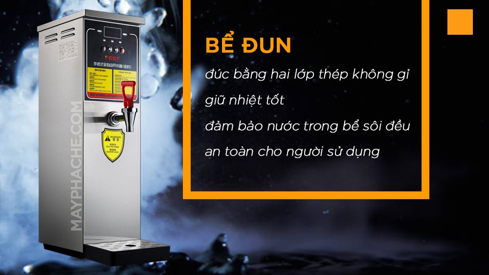 Mọi chi tiết máy đều được làm bằng chất liệu bền bỉ và an toàn tuyệt đối. Cụ thể như: Bề đun nước làm bằng 2 lớp thép không gỉ cao cấp. Đây là dòng thép được ứng dụng trong lĩnh vực ý tế và chế biến thực phẩm. Nước được đun sôi nhanh, giữ nhiệt tốt và không lo bị nhiễm các chất độc hại.