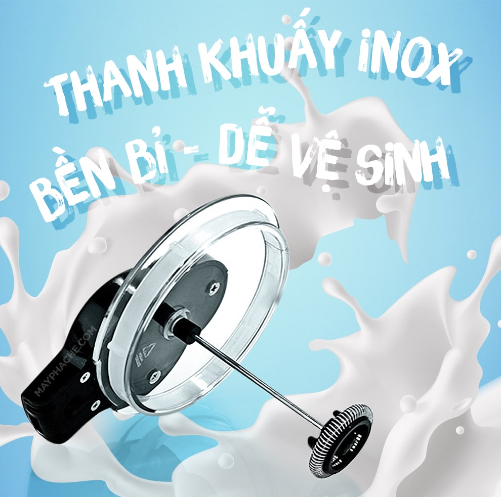 Thanh khuấy của máy cũng được làm bằng inox 304 không han gỉ; kết hợp công suất mạnh mẽ giúp tạo bọt sữa và pha chế đồ uống siêu nhanh. Máy tạo bọt và pha chế an toàn cho sức khỏe của thực khách.