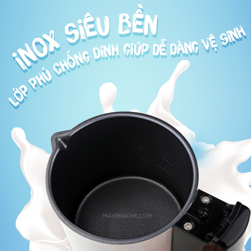Máy tạo bọt sữa được làm bằng inox cao cấp 304, dày dặn; siêu bền bỉ và hoàn toàn chống han gỉ. Bề mặt inox được phủ thêm lớp chống dính giúp bạn dễ dàng vệ sinh.
