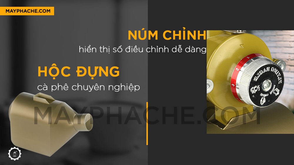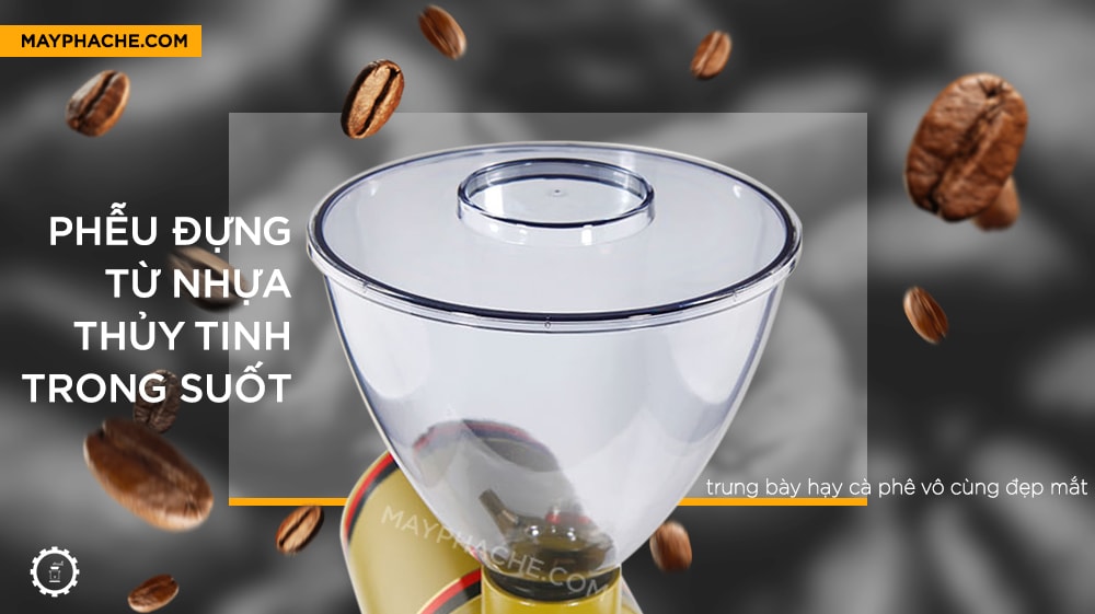 Việc vệ sinh máy không gặp bất cứ khó khăn nào với chốt vặn bằng tay có thể tháo lắp dễ dàng. Bên cạnh đó, nếu bạn muốn trưng bày hạt cà phê để tăng thêm sự độc đáo cho không gian quán cũng không phải chuyện khó khăn. Máy có một gạt chặn cà phê có thể kết hợp với phễu nhựa trong suốt. Phễu này được thiết kế với hình dáng ấn tượng, lạ mắt.